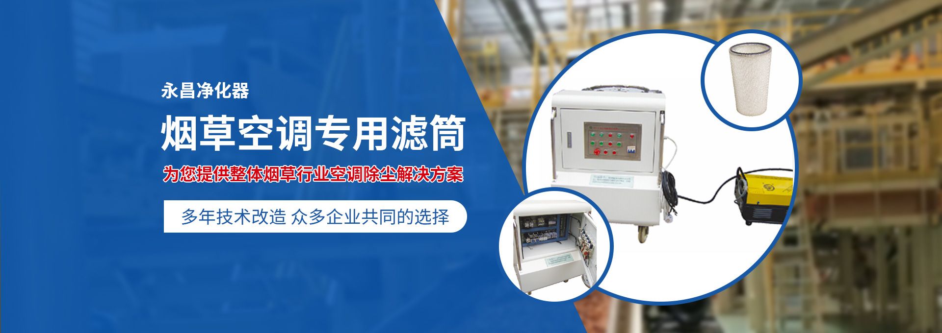 新鄉市永昌凈化器有限公司是生產煙草行業空調除塵專用濾筒的企業。注冊資金1000萬元。已通過ISO9001國際質量管理體系認證。對產品有嚴格的管理制度和售后服務。我公司以誠信、負責、守信譽、重質量的精神所生產的產品,近幾年來在煙草行業受到廣泛應用,并受到用戶的一致好評?! 囊痪啪潘哪暌詠頌闊煆S的空調設備服務。十幾年來,我們不斷走出去請進來學習新技術。定期到用戶那里咨詢情況:互相交流,認真聽取寶貴意見,不斷提高產品質量。從經濟和安全,方便的角度出發,根據煙廠濕度大的生產環境和濾筒收集到的含酸堿、氧化劑的粉塵。在空調箱工作狀態下我們頂著巨大的風壓危險在箱內停留了幾分鐘,認真查看濾筒工作情況,發現濾筒有并死狀態,造成濾筒不過濾、不過風、壓差高的現象。經幾十次試驗分析,在標本兼治的原則下,有針對性的解決了這一問題?! ∥夜踞槍煆S制絲、卷接包、混絲間、儲絲房、冷卻床、梗膨化等不同的生產環境,